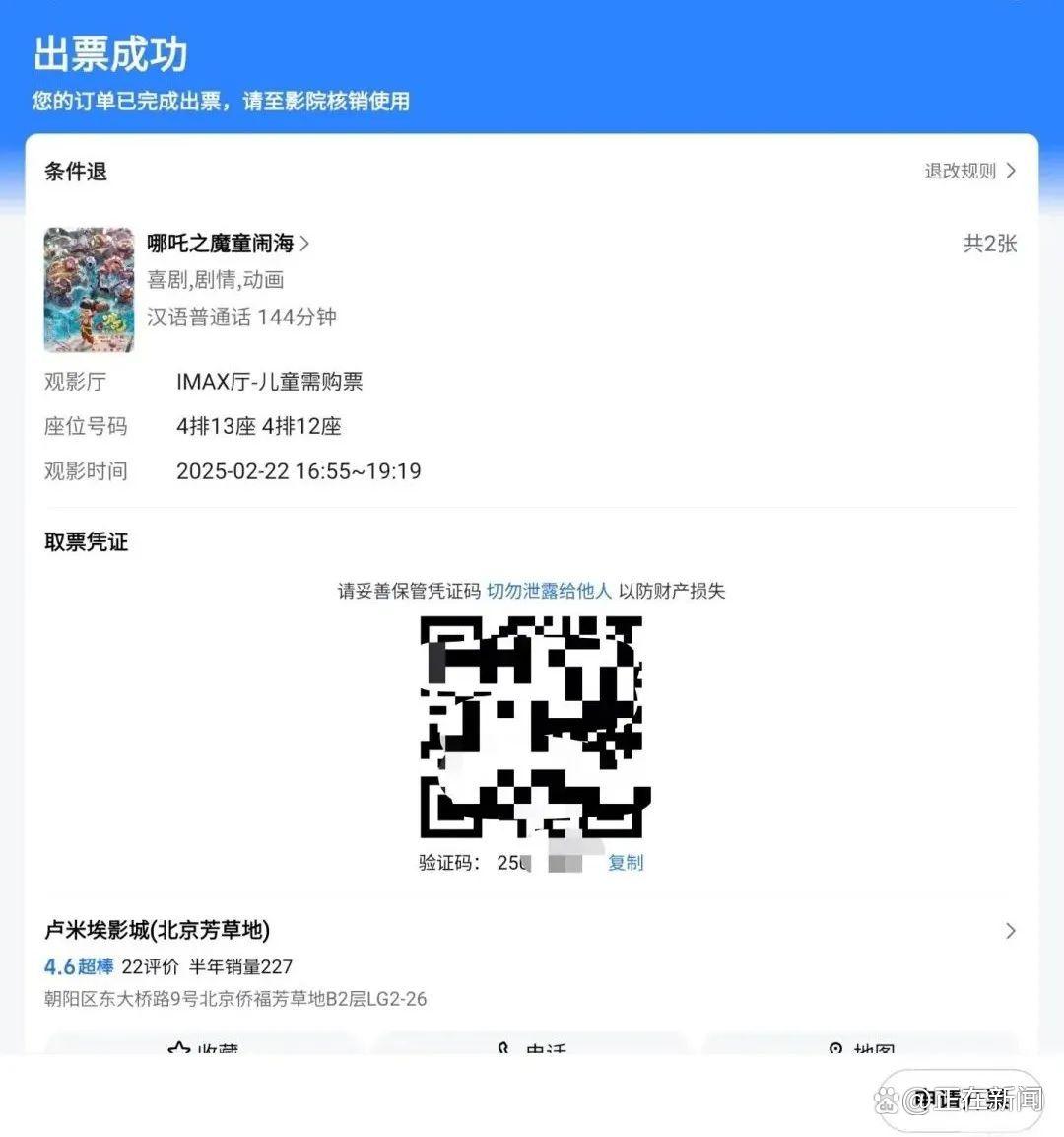 2月26日,北京的张先生(化名)向《正在新闻》反映,他2月21日通过高德地图平台购买卢米埃影城(北京芳草地店)2月22日IMAX厅的两张《哪吒之魔童闹海》电影票,共计支付258元。