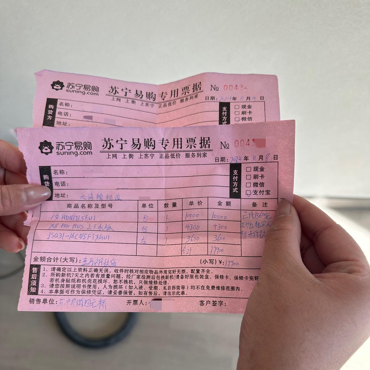 北清橡树湾业主有的通过团购群直接联系销售员购买,有的则经由群里的销售员介绍到线下门店购买。但扫码付款时,用的都是销售员的个人经营码。销售员收款后开具了写有“苏宁易购专用票据”的收据,里边详细记录了购买人、产品型号、价格及收款人等信息。
