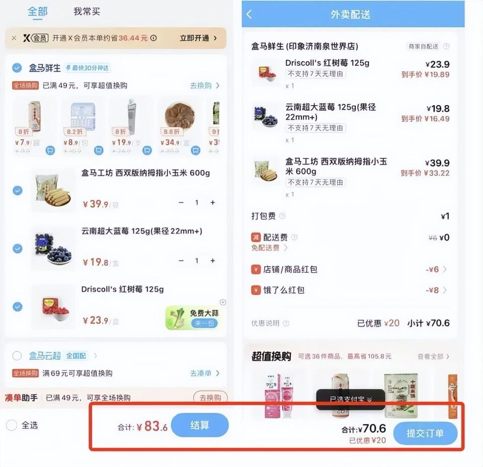 新黄河记者分别用盒马X会员用户、普通用户、新用户三种账号对比价格,发现在非会员日,除部分会员价商品,X会员账号与普通账号价格大致相同,而新用户享有前三单免运费的优惠政策,部分商品显示新人优惠价格。此外,新黄河记者调查发现,第三方外卖平台可领取平台优惠券进行抵扣,部分商品价格低于盒马App。对此,13日,盒马相关负责人回应称,盒马在三方平台的定价是统一的,饿了么平台每个月定期有商品的补贴活动,属于平台活动,同时该负责人对“大数据杀熟”予以否认。