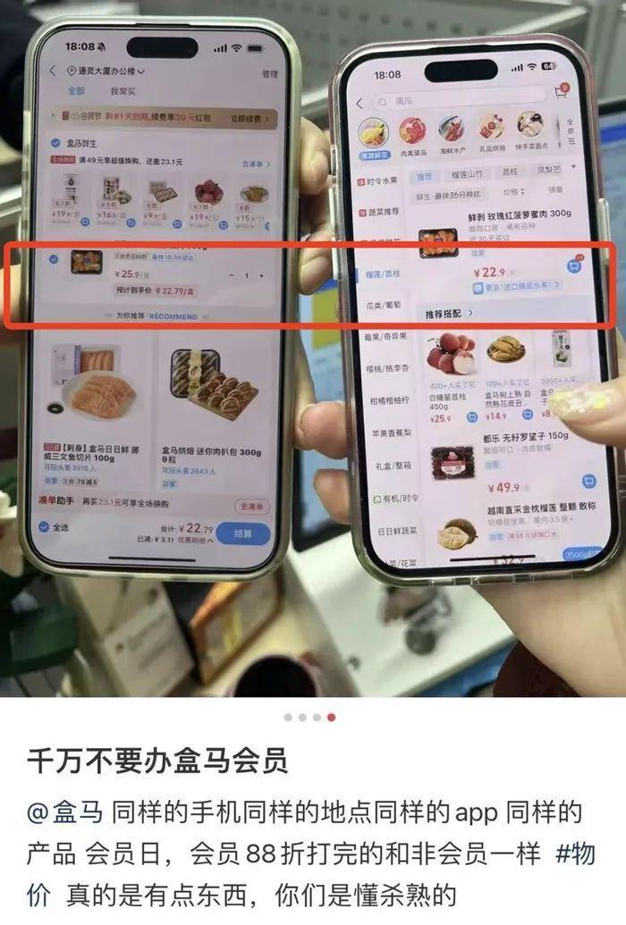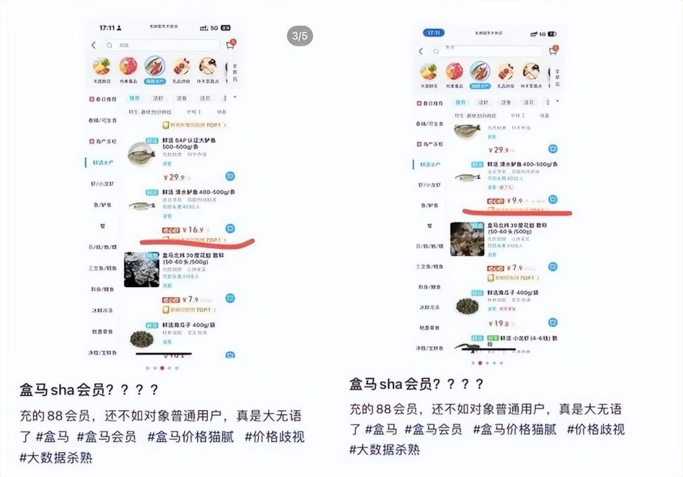 除刘文外,不少用户在社交平台反映盒马“大数据杀熟”现象,有用户举例,“同样的手机、同样的地点、同样的App、同样的产品,盒马会员日,会员88折打完价格与非会员一样。”另有网友以一条400g到500g的鲜活清水鲈鱼举例,X会员价格为16.9元,普通用户价格为9.9元,并发文称“充了盒马88会员,还不如普通用户。”