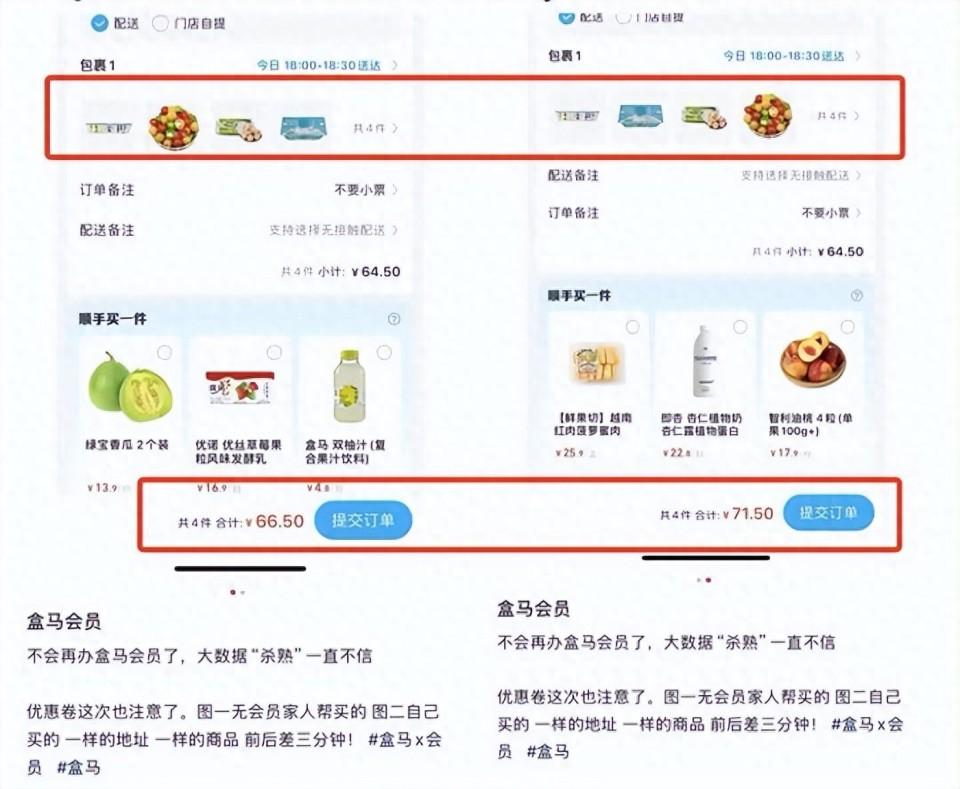 日前,消费者刘文(化名)在一款社交平台发文吐槽盒马鲜生App“大数据杀熟”,购买同样商品且下单门店相同的情况下,X会员(盒马升级后的会员)比普通会员使用优惠券后的价格更贵。刘文称普通用户的优惠券会不定时发放,而办理X会员后优惠券的派送次数反而变少。