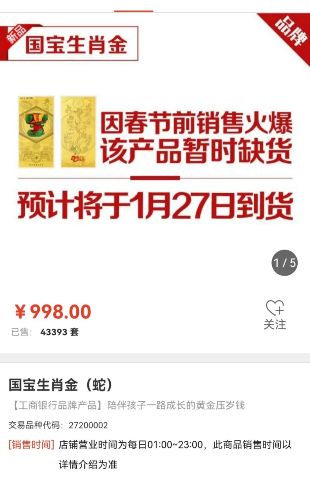 工商银行的工作人员也表示,近期金钞和金条预约火爆,需要提前订购预留好调货和物流时间,而且货源随着春节临近会越发紧张。该行手机银行APP的线上购买渠道显示,定价为998元一套的1克重“国宝生肖金”销量已达43393套,因春节前销售火爆暂时缺货。此外,一款与经典国漫《斗破苍穹》联名的蛇形项链同样售罄。