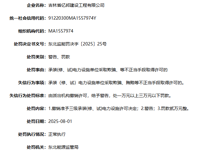 近日,国家能源局资质和信用信息系统披露处罚信息显示,吉林省亿邦建设工程有限公司因承装(修、试)电力设施单位采取欺骗、等不正当手段取得许可的,被东北能源监管局撤销准予三级承装(修、试)电力设施许可决定;警告;罚款贰万元整。