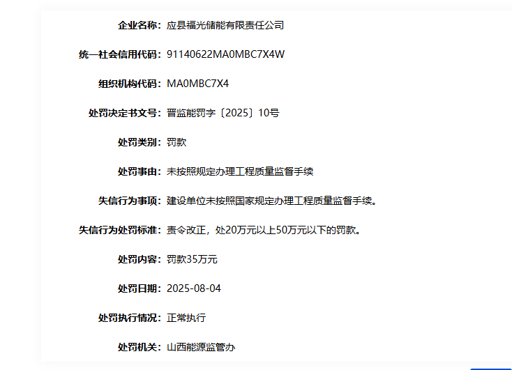 近日,国家能源局资质和信用信息系统披露处罚信息显示,应县福光储能有限责任公司因未按照国家规定办理工程质量监督手续,被山西能源监管办罚款35万元。