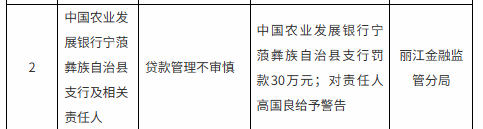中国农业发展银行宁蒗彝族自治县支行及相关责任人因贷款管理不审慎被罚