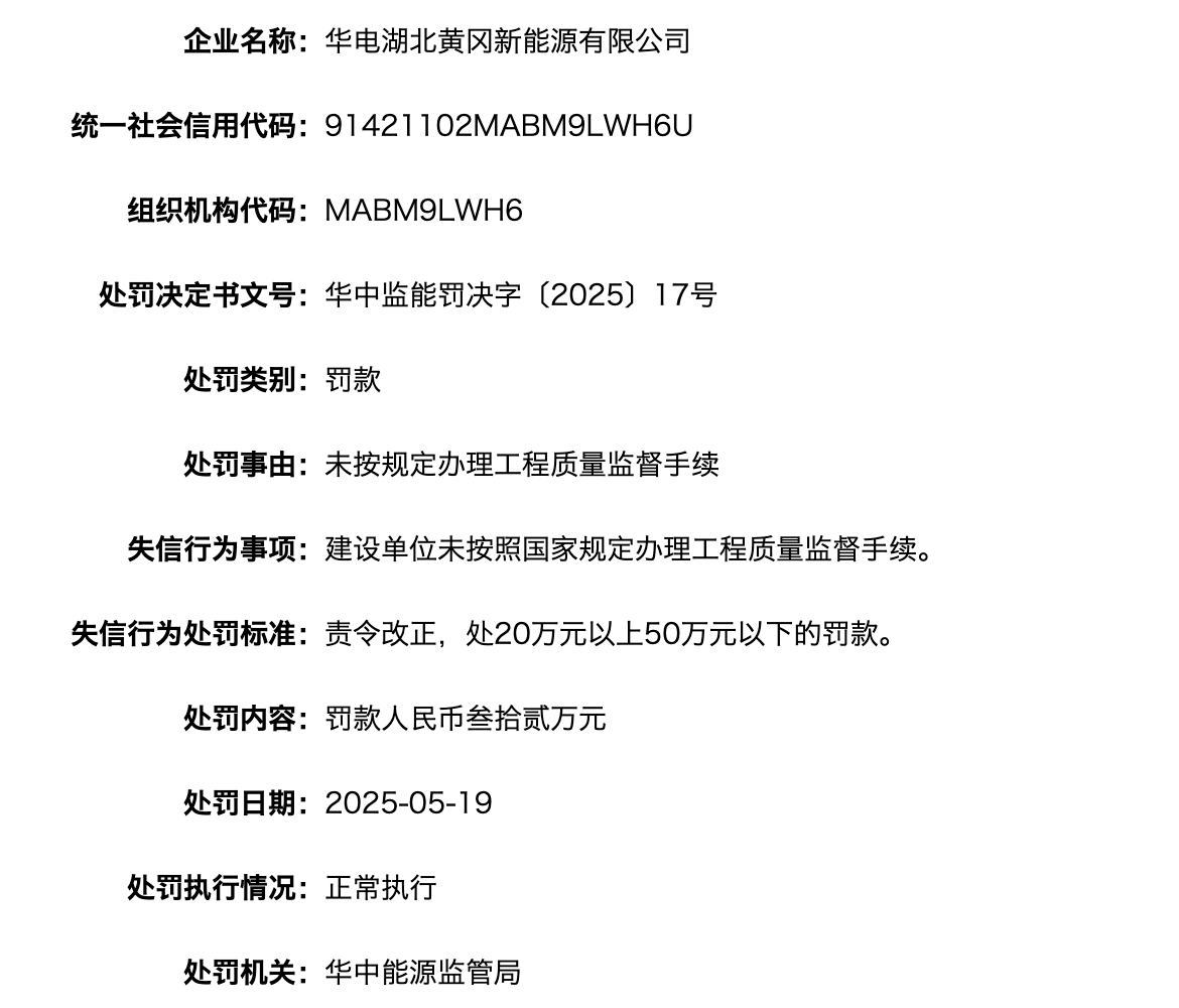 近日,国家能源局资质和信用信息系统披露处罚信息显示,华电湖北黄冈新能源有限公司,因未按规定办理工程质量监督手续,被华中能源监管局罚款人民币叁拾贰万元。