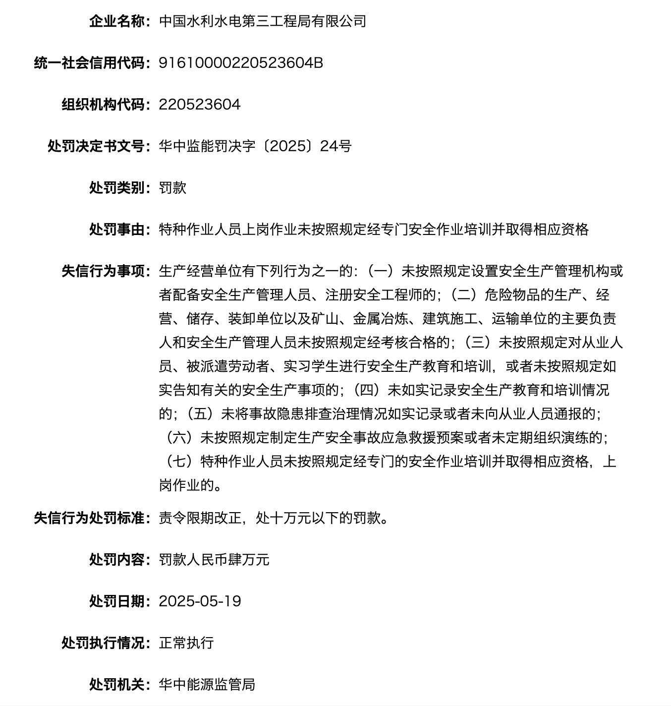近日,国家能源局资质和信用信息系统披露处罚信息显示,中国水利水电第三工程局有限公司,因特种作业人员上岗作业未按照规定经专门安全作业培训并取得相应资格,被华中能源监管局罚款人民币肆万元。