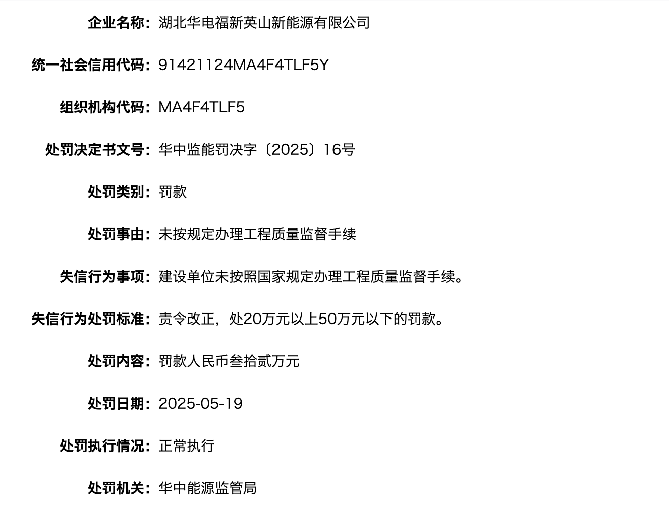 近日,国家能源局资质和信用信息系统披露处罚信息显示,湖北华电福新英山新能源有限公司,因未按规定办理工程质量监督手续,被华中能源监管局罚款人民币叁拾贰万元。