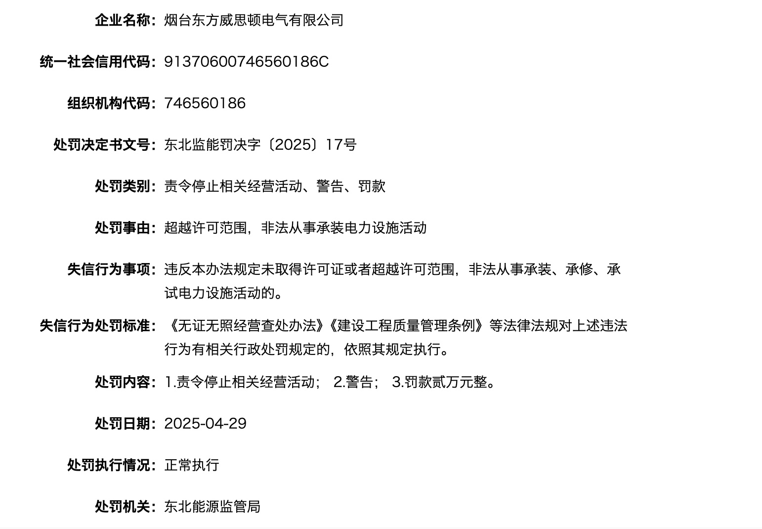 近日,国家能源局资质和信用信息系统披露处罚信息显示,烟台东方威思顿电气有限公司,因超越许可范围,非法从事承装电力设施活动,被东北能源监管局责令停止相关经营活动;警告;罚款贰万元整。