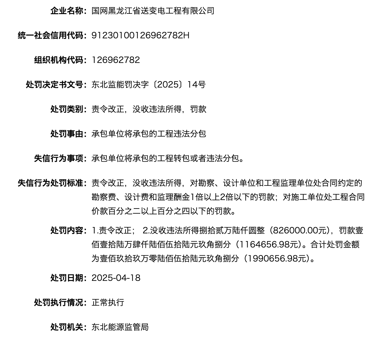 近日,国家能源局资质和信用信息系统披露处罚信息显示,国网黑龙江省送变电工程有限公司,因承包单位将承包的工程违法分包,被东北能源监管局责令改正;没收违法所得捌拾贰万陆仟圆整(826000.00元),罚款壹佰壹拾陆万肆仟陆佰伍拾陆元玖角捌分(1164656.98元)。合计处罚金额为壹佰玖拾玖万零陆佰伍拾陆元玖角捌分(1990656.98元)。