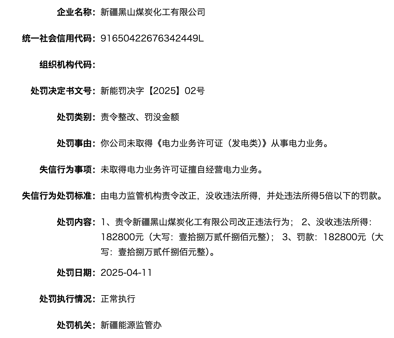 近日,国家能源局资质和信用信息系统披露处罚信息显示,新疆黑山煤炭化工有限公司,未取得《电力业务许可证(发电类)》从事电力业务,被新疆能源监管办责令改正违法行为,没收违法所得:182800元(大写:壹拾捌万贰仟捌佰元整);罚款:182800元(大写:壹拾捌万贰仟捌佰元整)。