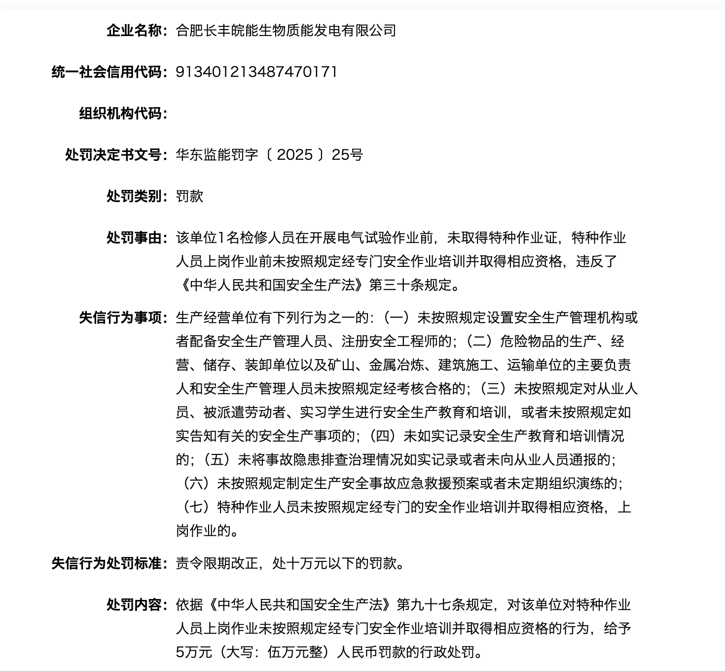 近日,国家能源局资质和信用信息系统披露处罚信息显示,合肥长丰皖能生物质能发电有限公司,因1名检修人员在开展电气试验作业前,未取得特种作业证,特种作业人员上岗作业前未按照规定经专门安全作业培训并取得相应资格,违反了《中华人民共和国安全生产法》第三十条规定。