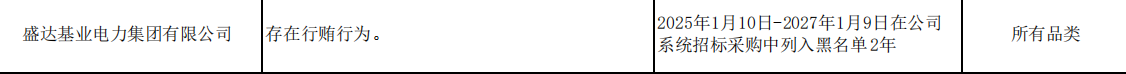 其中,盛达基业电力集团有限公司,因存在行贿行为,被国家电网于2025年1月10日-2027年1月9日在公司系统招标采购中列入黑名单2年,处理范围为所有品类。公告指出,供应商整改完毕后,向提出不良行为处理的单位或专业部门提交整改报告等材料,经相关单位或部门验收合格后,方可在处理期满后解除。
