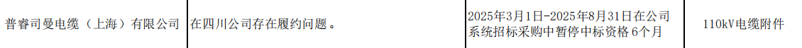 其中,普睿司曼电缆(上海)有限公司,因在四川公司存在履约问题,被国家电网于2025年3月1日-2025年8月31日在公司系统招标采购中暂停中标资格6个月,处理范围为110kV电缆附件。
