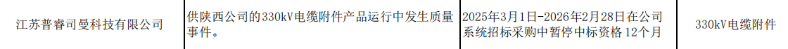 江苏普睿司曼科技有限公司,因供陕西公司的330kV电缆附件产品运行中发生质量事件,2025年3月1日-2026年2月28日在公司系统招标采购中暂停中标资格12个月,处理范围为330kV电缆附件。