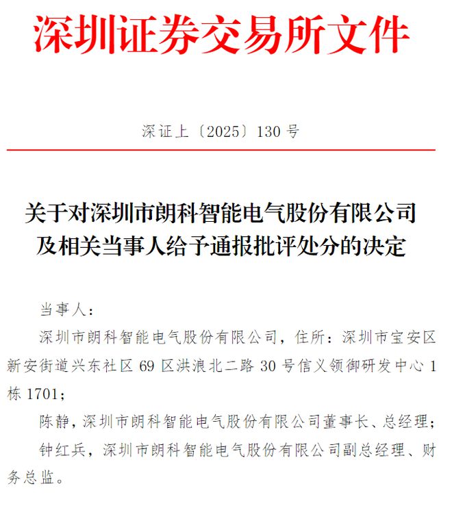 根据《创业板股票上市规则》相关规定,深交所决定对朗科智能及陈静、钟红兵给予通报批评处分,并将相关违规行为及处理结果记入上市公司诚信档案。