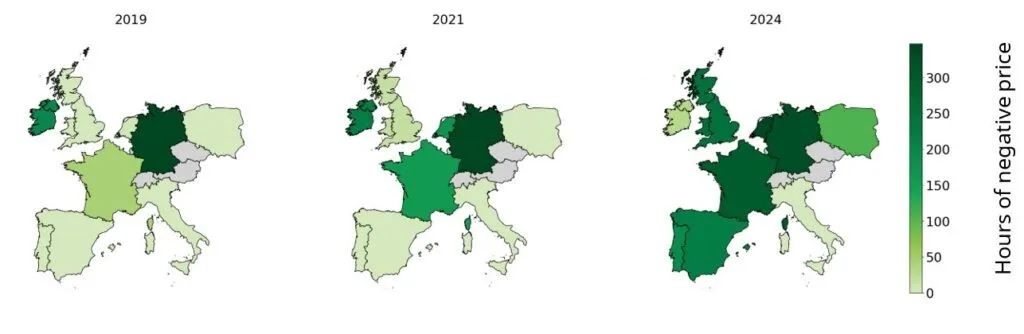 德国并非唯一一个经历负电价时长增长的国家。欧洲电力交易所(Epex Spot)数据显示,2024年,德国的负电价时长达到468小时,较前一年的292小时增加了60%以上。与此同时,英国和法国的负电价时长也显著增长,法国部分核电站甚至因负电价问题在2024年6月停运。西班牙则首次出现了负电价现象,进一步说明负电价趋势正在欧洲蔓延。