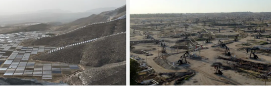 ▲中国山西省的太阳能场(左)vs美国加利福尼亚州的油田