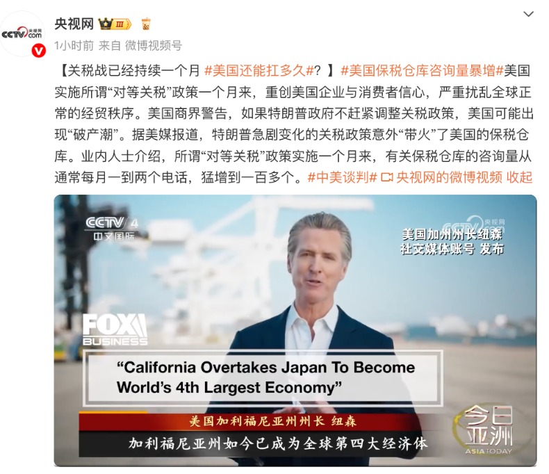 据新华社报道,美国加利福尼亚州州长加文·纽森日前在社交媒体发布的视频中抨击美国联邦政府,他表示,美政府当前关税政策“可能令美国丧失全球最大经济体地位”。