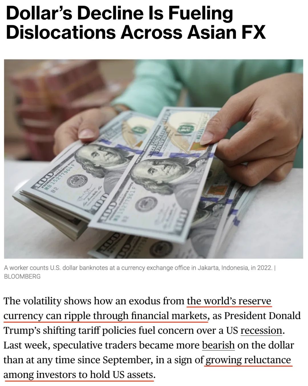 由于白宫近期关税乱拳对国际金融市场造成直接冲击,美国股市、债市、汇市出现了“三市齐跌”的罕见现象。分析普遍认为,这表明不少曾看好美国经济前景的投资者正与美元资产拉开距离,转投其他市场。