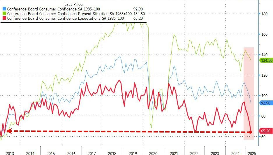 因对关税和通胀的担忧加剧,美国消费者信心指数连续第四个月下滑,降至四年来的最低水平。