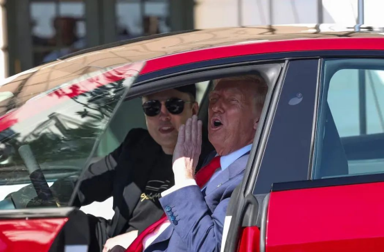 ▲当地时间3月11日,特朗普与马斯克在特斯拉Model S电动汽车内。图源:英媒