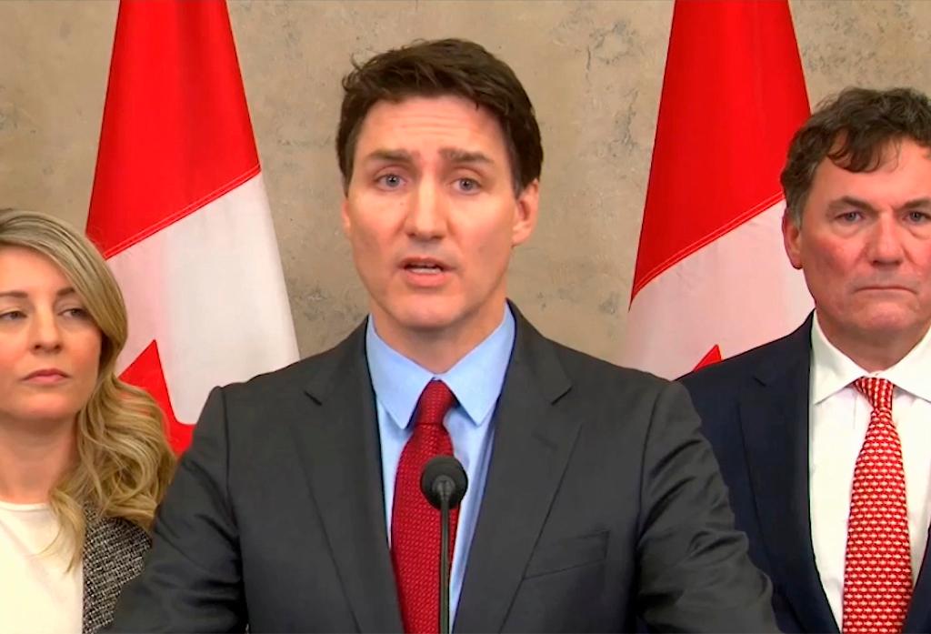 2月1日,加拿大总理特鲁多(中)在渥太华接受媒体采访(视频截图)。新华社发