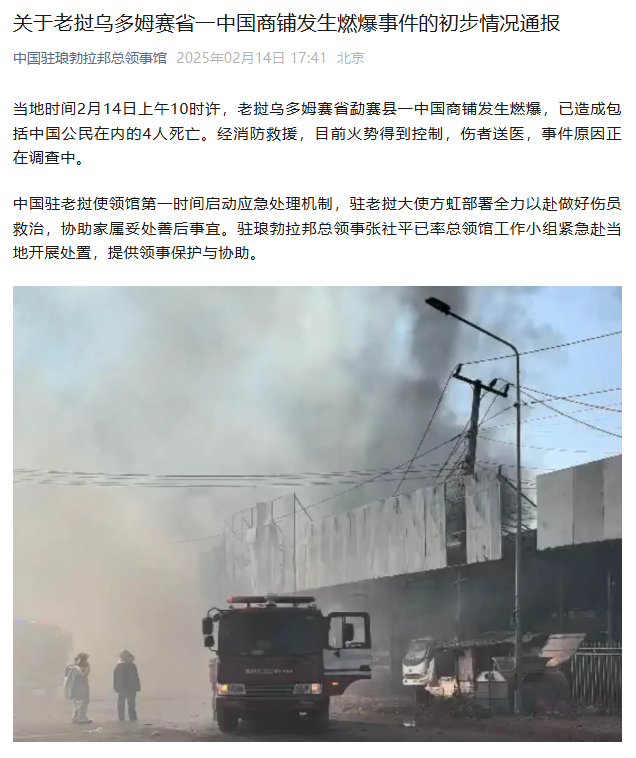 中国驻琅勃拉邦总领事馆2月14日通报:当地时间2月14日上午10时许,老挝乌多姆赛省勐赛县一中国商铺发生燃爆,已造成包括中国公民在内的4人死亡。经消防救援,目前火势得到控制,伤者送医,事件原因正在调查中。