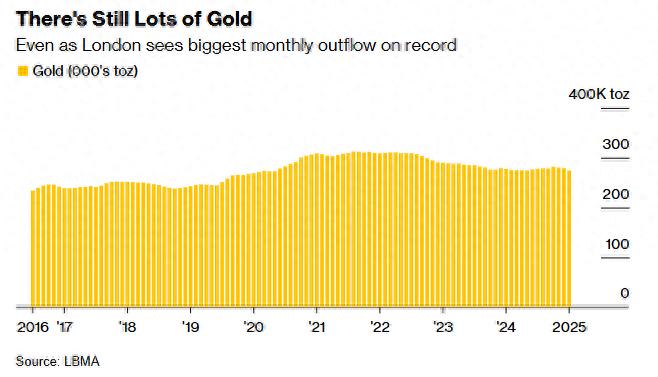 随着贵金属交易商急于将黄金运往美国以规避潜在关税风险并赚取套利差价,1月份伦敦金库中储存的黄金数量减少了490万盎司,这是自2016年有记录以来的最大月度降幅。
