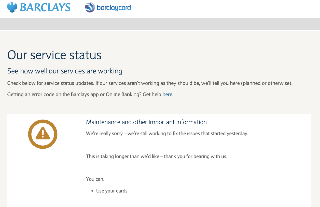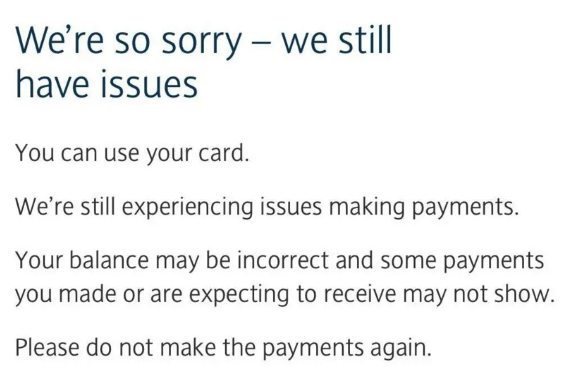截至北京时间周日凌晨,巴克莱银行的官网依然显示:很抱歉,仍在修复前一天发生的系统问题。