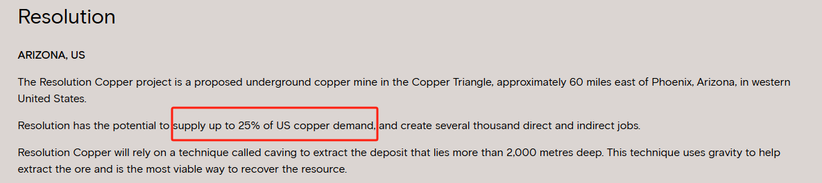 根据力拓官网介绍,Resolution将采用一种名为“崩落法”的技术来开采深达2,000多米的矿床,“有望满足美国高达25%的铜需求,并创造数千个直接和间接就业机会。”