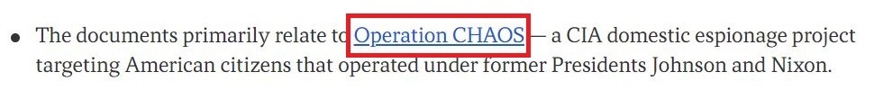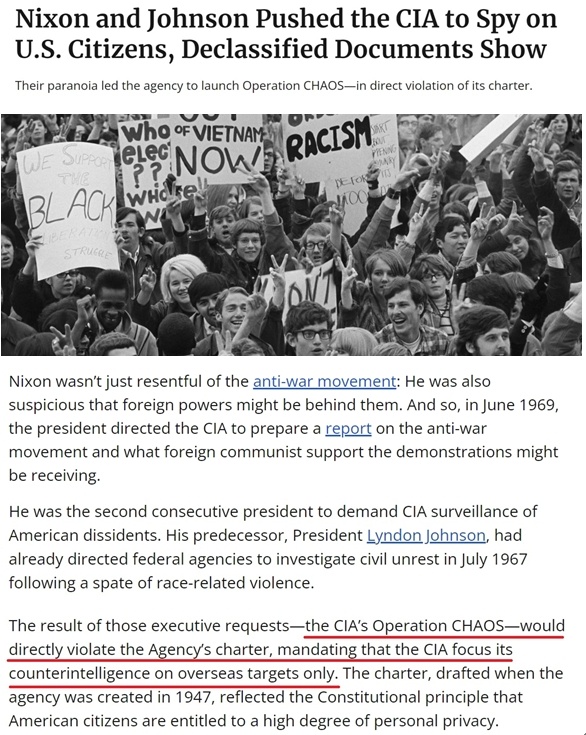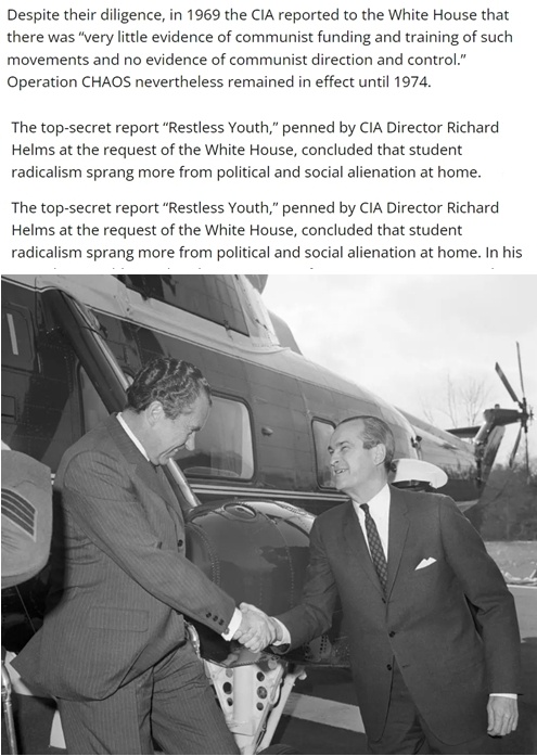 继任的尼克松进一步扩大了“混沌行动”,并于1969年6月明确指示中情局准备一份关于美国国内反战运动以及这些运动可能得到“外国支持”的报告。