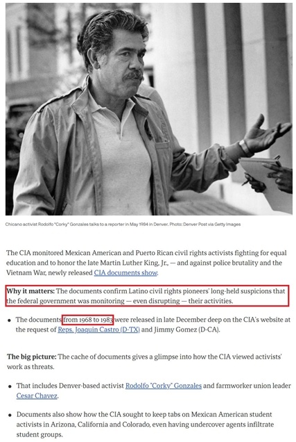 文件揭示,从1968年到1983年,中情局一直在监听、监视鲁道夫·“科基”·冈萨雷斯和塞萨尔·查韦斯等美国拉美裔民权活动人士的一举一动。他们均长期致力于要求实现平权和消除贫困。