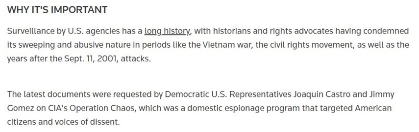 正如路透社所说,美国政府机构的监听监视行为历史悠久,历史学家和民权倡导人士在越南战争时期、民权运动时期以及“9·11事件”发生后的岁月里,都曾谴责过这种行为的广泛和滥用性质。