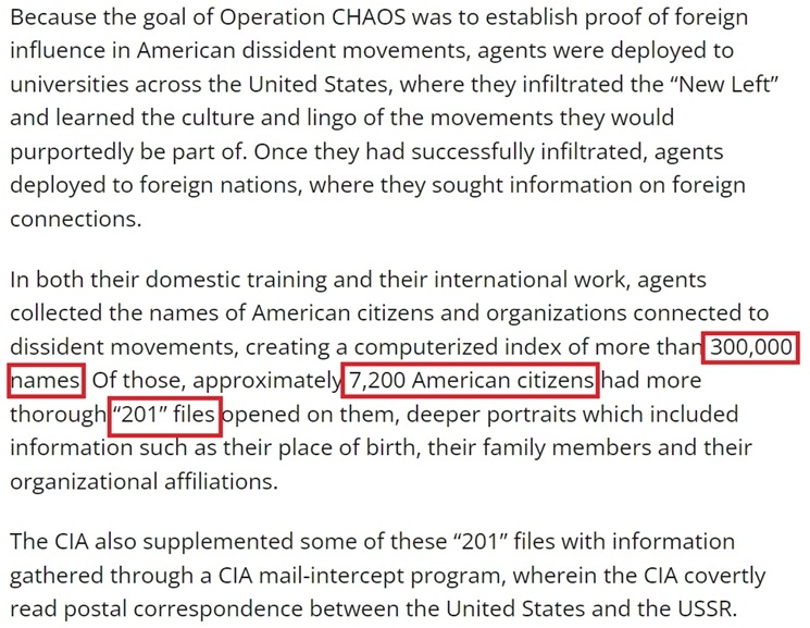 据悉,经过这些“努力”,中情局收集了30多万个与国内民权运动有关的美国公民和组织的名字。其中约有7200名美国人被建立了更全面的所谓“201”档案,涉及他们的出生地、家庭成员和组织隶属关系等各种信息。
