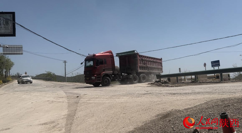 文保碑附近,不时有重型卡车驶出(摄于4月11日)。