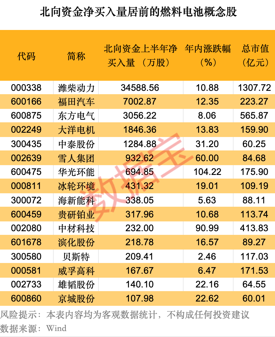 从北向资金净买入量来看,据数据宝统计,截至二季度末,有16只概念股获北向资金净买入量均超百万股,潍柴动力净买入达到3.46亿股,排在首位;福田汽车、东方电气、大洋机电、中泰股份等净买入量均超1000万股。