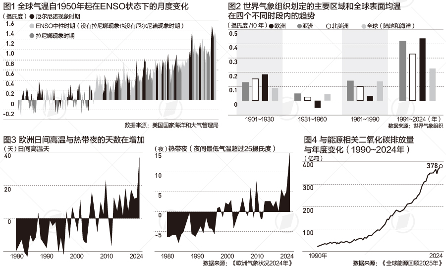 近年来越来越显著的全球变暖趋势进一步放大了“热穹顶”效应。世界气象组织今年3月发布的《2024年全球气候状况报告》显示,2024年很可能是首个全球年均温度较工业化前(1850~1900年平均值)升温超过1.5摄氏度的年份,升温幅度约为1.55摄氏度,成为175年来最热的一年。提供全球陆地温度数据的Berkeley Earth、欧洲中期天气预报中心的ERA5、美国国家航空航天局(NASA)维护的地球温度监测系统GISTEMP等多项数据集均表明,全球变暖的长期趋势在加剧。