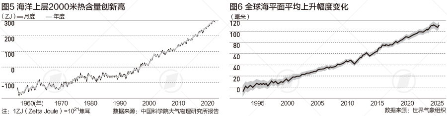 气候系统变暖的持续,使得全球海平面上升、冰川消融的趋势近些年来显著加速。众所周知,海洋表面温度是海洋和大气相互作用的关键变量,能够影响较大范围的天气与气候。根据中国科学院大气物理研究所数据,2024年全球海洋表面平均温度比2023年升高0.07摄氏度。同时,来自不同研究机构的数据一致表明,2024年海洋上层2000米热含量也达到历史新高。