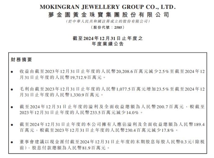 3月28日,梦金园公布其上市以来的首个财报。数据显示,报告期内,梦金园全年实现营收197.1亿元,相较于上一年同期的202.09亿元,同比减少2.5%;净利润1.89亿元,同比下降17.8%。