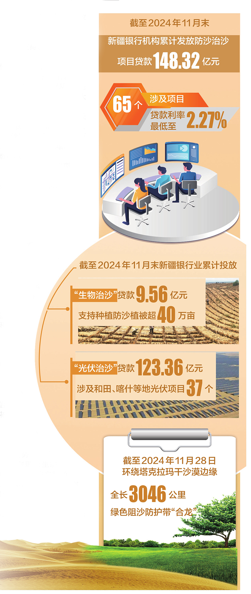 据不完全统计,截至2024年11月末,新疆银行业累计投放“生物治沙”贷款9.56亿元,支持种植防沙植被超40万亩;累计投放“光伏治沙”贷款123.36亿元,涉及和田、喀什等地37个光伏项目。