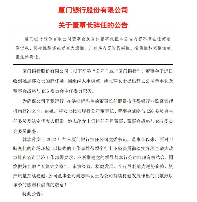 日前,厦门银行发布公告,该行董事会于近日收到姚志萍的辞任函,因组织人事调整,姚志萍提出辞去该行董事长及董事会战略与ESG委员会主任委员职务。
