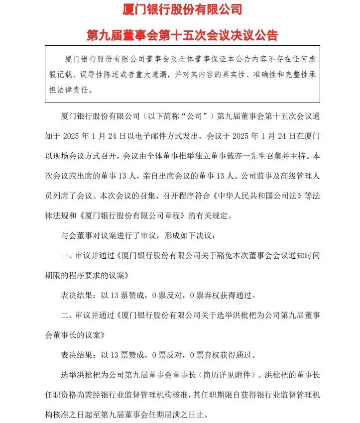 同日,该行发布厦门银行第九届董事会第十五次会议决议公告显示,该行第九届董事会第十五次会议于2025年1月24日召开,审议并通过《厦门银行股份有限公司关于选举洪枇杷为公司第九届董事会董事长的议案》,选举洪枇杷为该行第九届董事会董事长。洪枇杷的董事长任职资格尚需经银行业监督管理机构核准,其任职期限自获得银行业监督管理机构核准之日起至第九届董事会任期届满之日止。在洪枇杷的董事长任职资格获得银行业监督管理机构核准之前,由姚志萍代为履行公司董事长及法定代表人职责。