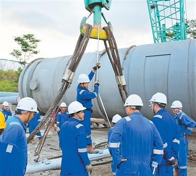 在印尼卢穆特巴莱二期地热电站项目现场,工作人员开展分离器就位吊装工作。 山东电建三公司供图