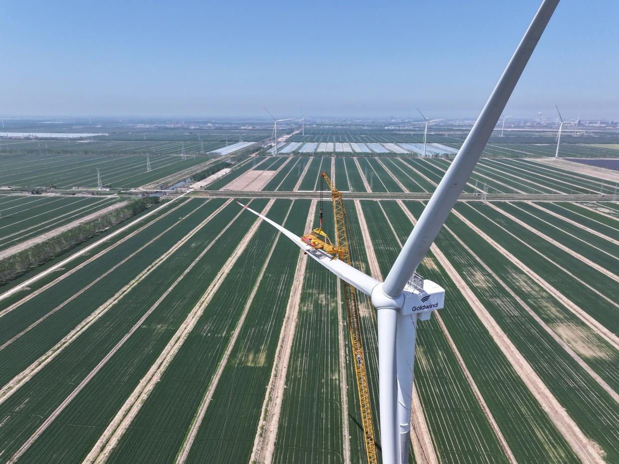 4月20日,中国铁建电气化局建设者在江苏省盐城市大丰区安装16.2兆瓦风电机组。该风电机组轮毂中心高155米,相当于50多层大楼的高度,扫风面积超5万平方米。(新华社发)