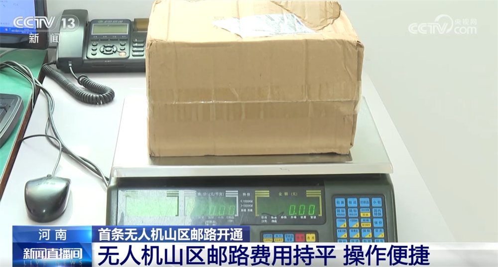 林州市石板岩镇邮政营业所经理马长青称:“客户来了以后,他拿着东西,然后装到包装箱里面,先在秤上称重,然后手机扫码填写信息,把面单自动打印出来以后贴到箱子上,然后放到包裹存放处,放到这以后,飞机过来了,由工作人员放到飞机上,直接就寄出去了。”