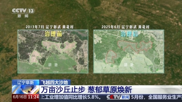 对比卫星遥感影像,我们发现,曾经因风沙侵袭形成的、像波浪一样的连片沙丘地貌,如今已经被密集的植被覆盖。