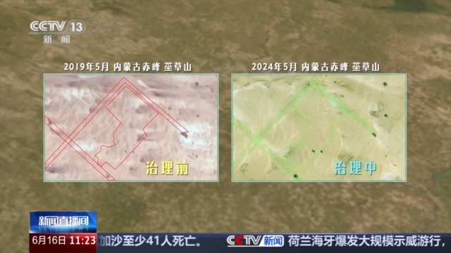 去年5月,当地启动莝(cuò)草山沙地综合治理。我们通过卫星遥感影像,甚至能清晰地看到当时壮观的治理场景,密密麻麻的草方格,将原本大片的黄色沙地覆盖。那么,这里的治理效果如何呢?