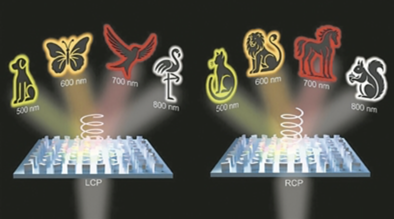 自旋和波长复用元全息图(示意图)。该全息图使用单元超表面对多个图像进行编码,其中不同的图像基于入射自旋态和工作波长出现在同一平面上。图片来源:《先进科学》杂志