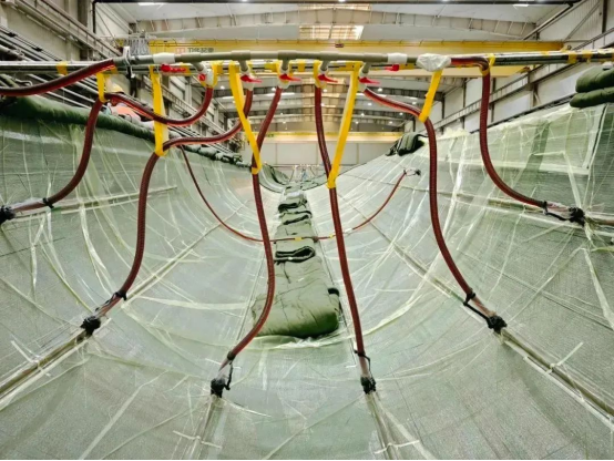 时代新材风电产品事业部开发中心副主任陈煌介绍,TMT82是一款专为大型风力发电机设计的叶片,长度为82米,扫风面积超过21000平方米,相当于3个标准足球场大小。TMT82由可回收热固性树脂和玻璃纤维复合材料制成,其外形经过精密空气动力学优化,采用类似飞机机翼的流线型设计,能够高效捕捉风能。